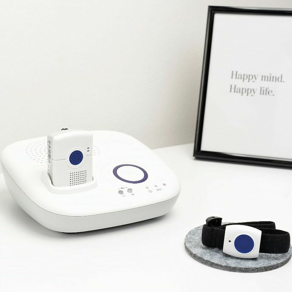 Dieses Mobilrufgerät ist dank seiner Ladeschale mit integriertem Lautsprecher auch als klassisches Hausnotrufgerät nutzbar. Beim Verlassen des Wohnraumes wird das Mobilgerät einfach aus der Ladeschale genommen. Mit dem dazugehörigen Funksender kann jederzeit ein Alarm ausgelöst werden.